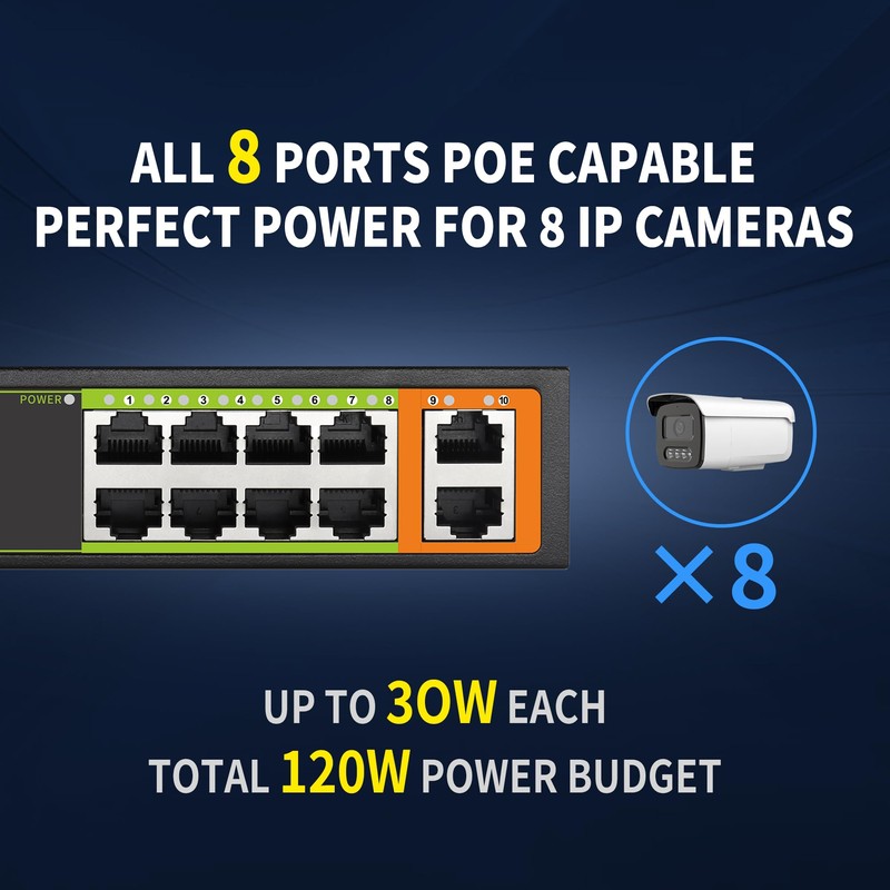 - 10 PortsInclude 8 PoE ports and 2 uplink ports,10/100Mbps speed on each port,The 2 uplink ports can be connected to different networks or devices, such as routers, NVRs, ect,and the 8 PoE ports are prefect for IP cameras and other POE devices.