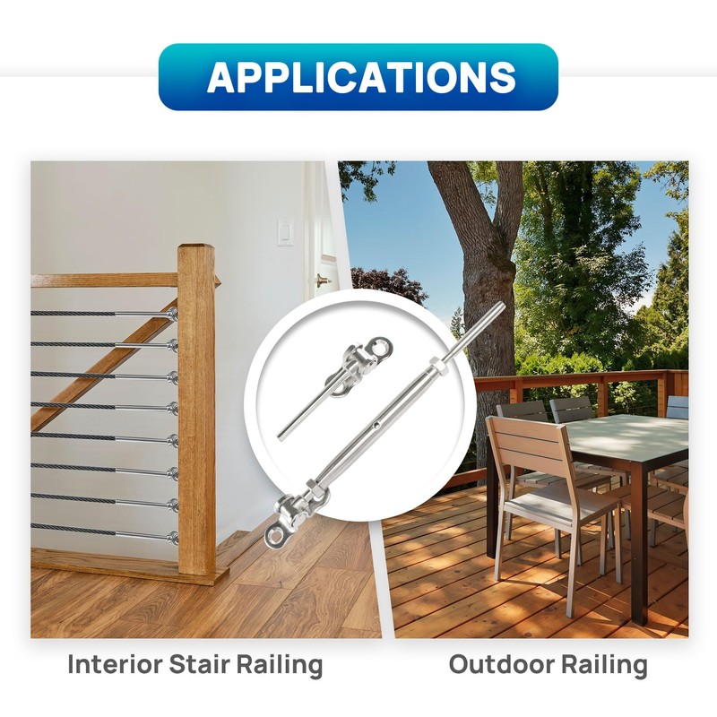- Versatile application: This kit is suitable for a wide range of cable railing systems, including inclined stair railings, horizontal and vertical cable guardrails, deck railings, and garden fences