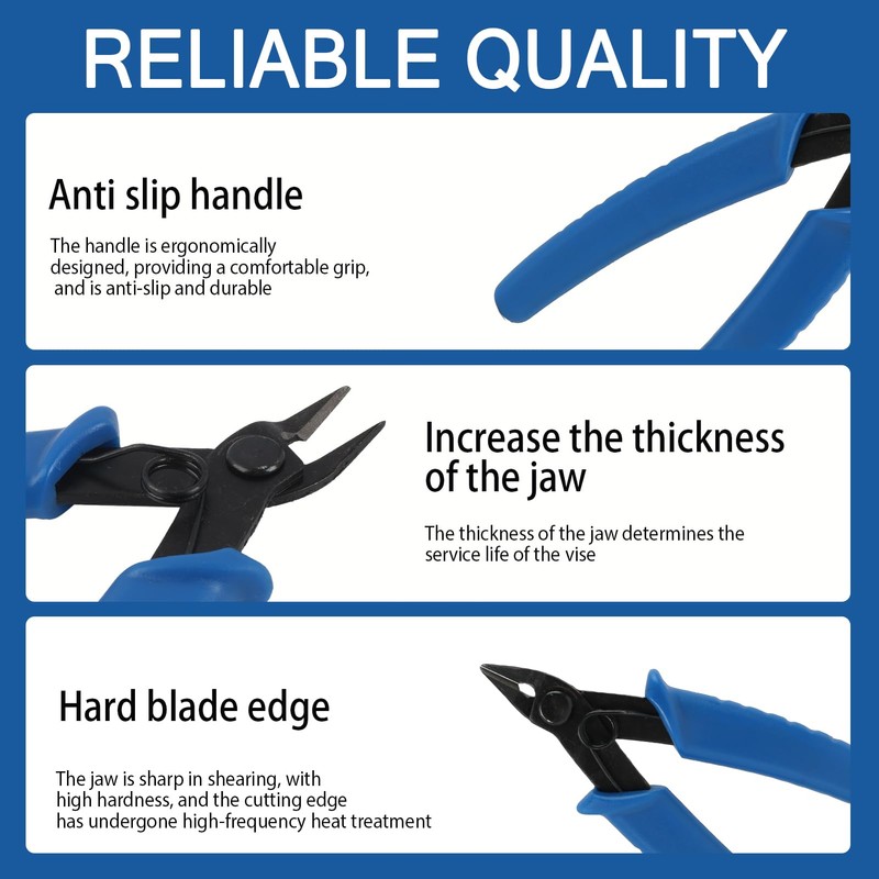 Upgrade your toolkit with these Precision Side Wire Cutters (129mm) – the ideal solution for anyone working with delicate wiring, electronics, jewelry, or intricate model-making projects. Engineered with high-precision carbon steel blades and an ergonomic design, these flush cutters deliver professional-grade results whether you're a hobbyist or a technician. Designed for Clean, Precise CutsThese flush cutters are capable of slicing through copper wire (up to 1.2mm), soft iron (up to 0.8mm), plastic burrs, and soft metals with precision. Whether you're repairing circuit boards, creating custom jewelry, or building scale models, these diagonal pliers offer the accuracy and control needed to get the job done right.Built to LastMade from hardened carbon steel (HRC51–53), the blades are tough enough for continuous use while resisting rust and dulling. Their fine edge ensures clean, flush cuts every time, making your work cleaner and more efficient. Ergonomic for Comfort and ControlMeasuring only 129mm, these compact cutters are lightweight and easy to maneuver in tight spaces. The handles are wrapped in a soft, anti-slip PVC material, reducing fatigue and improving control. Whether you're working at a bench or in the field, you'll appreciate the comfort during extended use.For a Wide Range of ApplicationsThese versatile wire snips are a must-have for:Electronics repair techniciansDIY hobbyists and makersJewelry artists3D model builders and plastic modellersElectricians working on low-voltage cable Important Usage NoticePlease do not use these cutters on high-hardness materials such as steel wire or hard iron rods. Doing so may damage the blades or reduce their cutting efficiency. These are intended for light to medium cutting tasks involving soft wire and components. What’s in the Box:1 x Precision Flush Cutter (129mm, Blue)Supportive after-sale service with a satisfaction guaranteeWhether you're assembling delicate electronics or crafting intricate handmade jewelry, these side wire cutters offer the precision, comfort, and reliability you need. Add them to your toolbox today and elevate your cutting performance with confidence.