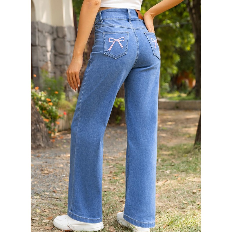 - Innovative Design: Featuring a convenient dual button closure and front welt pockets, these womens jeans are elevated with retro-chic back pockets adorned by bowknot embroidery. The dimensional bowknot embroidery delivers a bold Y2K-inspired contrast, creating a playful clash of edgy and sweet aesthetics. This statement-making detail seamlessly blends millennial nostalgia with modern functionality, offering the ultimate contemporary wardrobe staple that's both fashion-forward and practical
