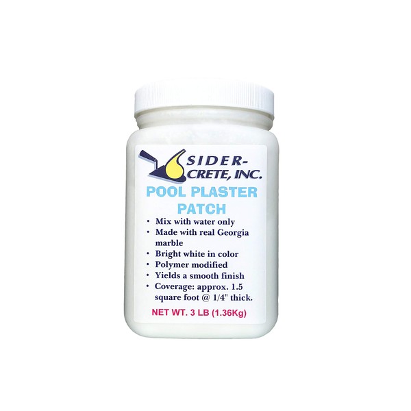 - Professional grade quality polymer modified pool plaster patch (3 lb container) . Mix with water only. 1.5 sf coverage @ 1/4". Sider Pool Plaster Patch is white in color and yields a smooth surface to match existing pool plaster. Supplied directly from Sider-Crete, Inc. Manufactured with marble and waterproof. Also available in a 20 lb and 50 lb pail.