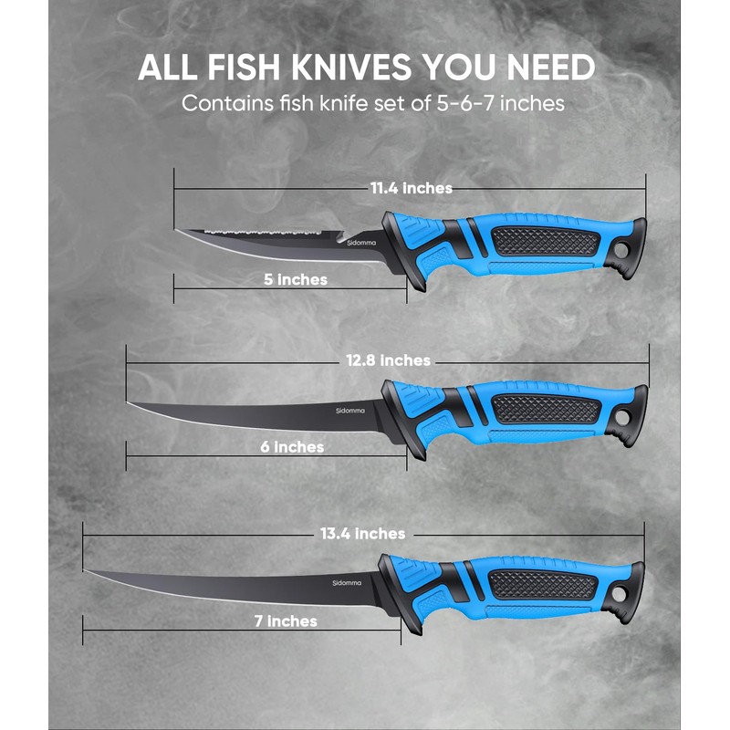 Sidomma Fillet Knife and Bait Knife Set Performance 5"-6"-7" G4116 German Flex Razor Sharp Stainless-Steel Blade with Sheath for Filleting and Boning, Pro Fishing Gear and Equipment Tools, Cool Fishing Gift for Men (Black-Blue)
