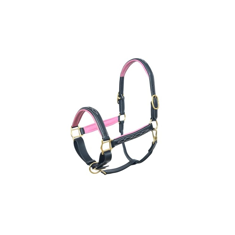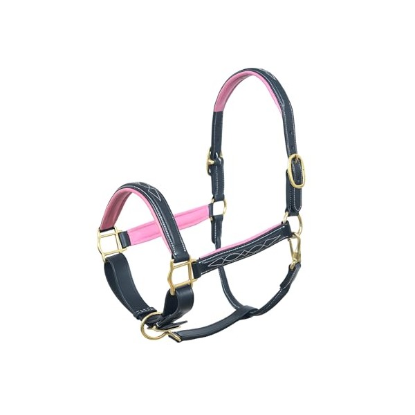 SIE Padded Leather Horse Halter with Brass Hardware and Raised Fancy Stitching (Black with Pink Padding, Cob)