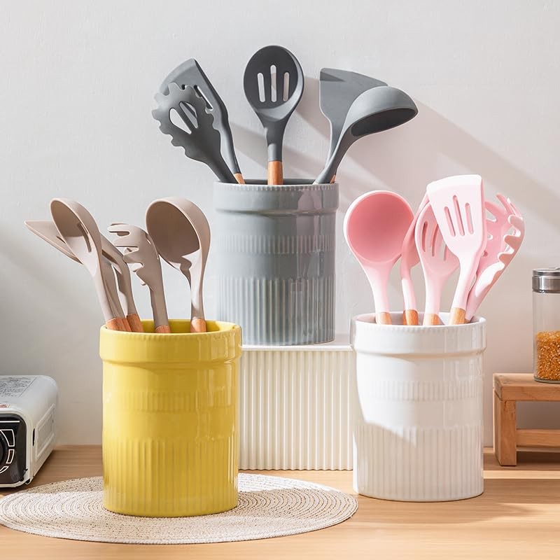 - [ELEGANT KITCHEN UTENSIL HOLDER] Designed with ridged texture, this utensil holder looks just modern & elegant standing on your kitchen counter, fits into your kitchen well