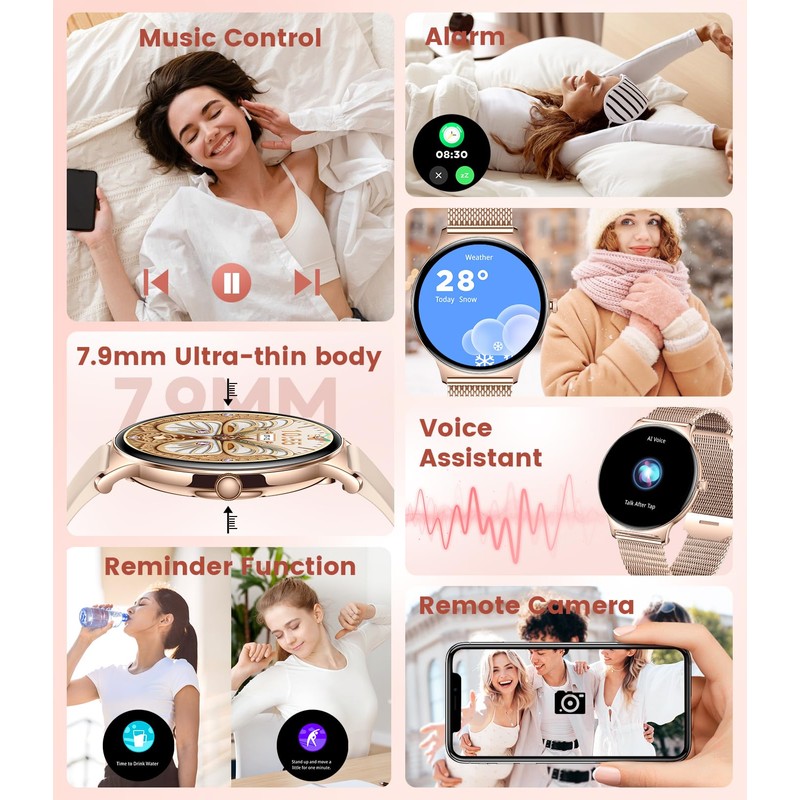 • 🍀 【The Ideal Gift-Ultra-Thin Design with Two Interchangeable Straps】This elegant 2024 Women's smartwatch stands out with its ultra-thin design and luxurious straps. The slim dial not only emphasizes the elegant style but also ensures high wearing comfort. The watch comes with two interchangeable straps – an ultra-thin mesh strap and a soft silicone strap – allowing you to easily adjust the style of the watch depending on the occasion. Whether for formal events, daily wear, or sports activities, this watch is the perfect companion, highlighting your unique sense of fashion.