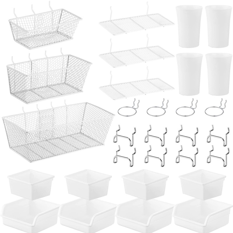 - A Complete Set for You: the package comes with 3 pieces of peg board racks and 3 pieces of pegboard baskets, 8 pieces of peg board bins in 2 different sizes, 4 pieces of pegboard cups, 8 pieces of hooks and 4 pieces of loops, 30 pieces in total, complete in combination to meet your storage needs