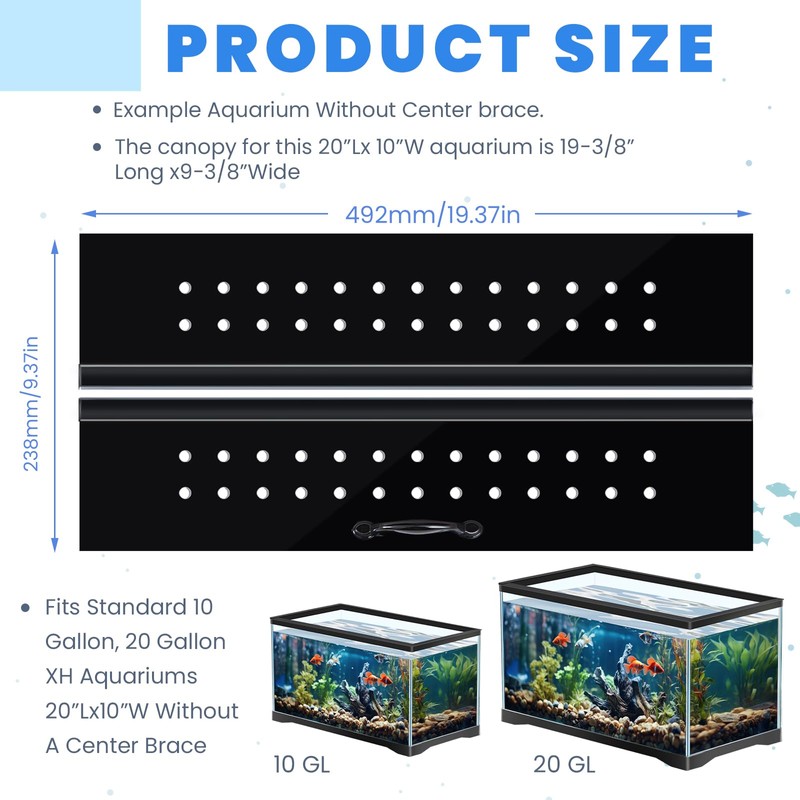 • Size Appropriateness: with the dimensions approximately 19.37 x 9.37 x 0.12 inch/49.2 x 23.8 x 0.3 cm, it serves as an optimal cover for 10 gallon, 20 gallon extra high aquariums 20" Long x 10" Wide Aquariums without center brace; This considerable size provides your aquatic pets with the necessary security they need; Please check the product size carefully to ensure it fits your fish tank