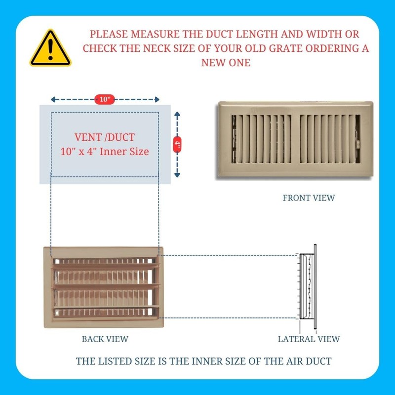 - FITMENT: Perfectly fits 4" x 10" duct openings, ensuring a precise match. It is essential to measure your duct size, as the register size corresponds to the duct opening before buying vents covers or registers.