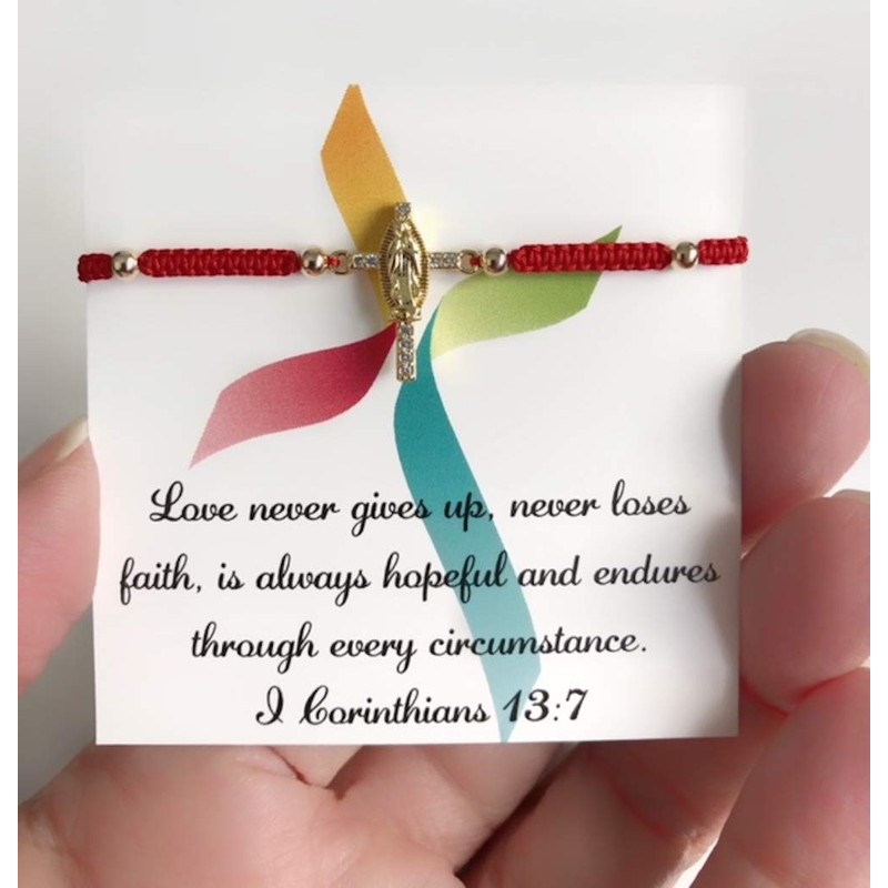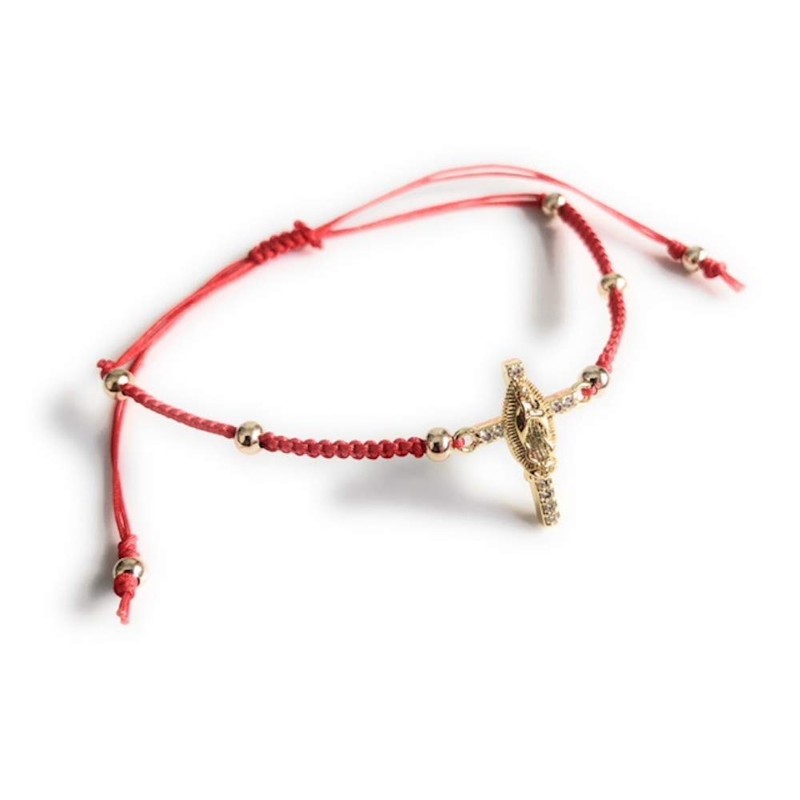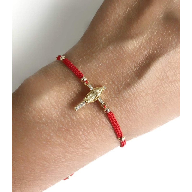 - Details: It is made with red string and macrame square knot. The center has a delicate 1.5 x 1.8 cm cross connector with the Our Lady of Guadalupe image. Adjustable from 6" to 9" inches. Very easy to put on and take off by yourself.