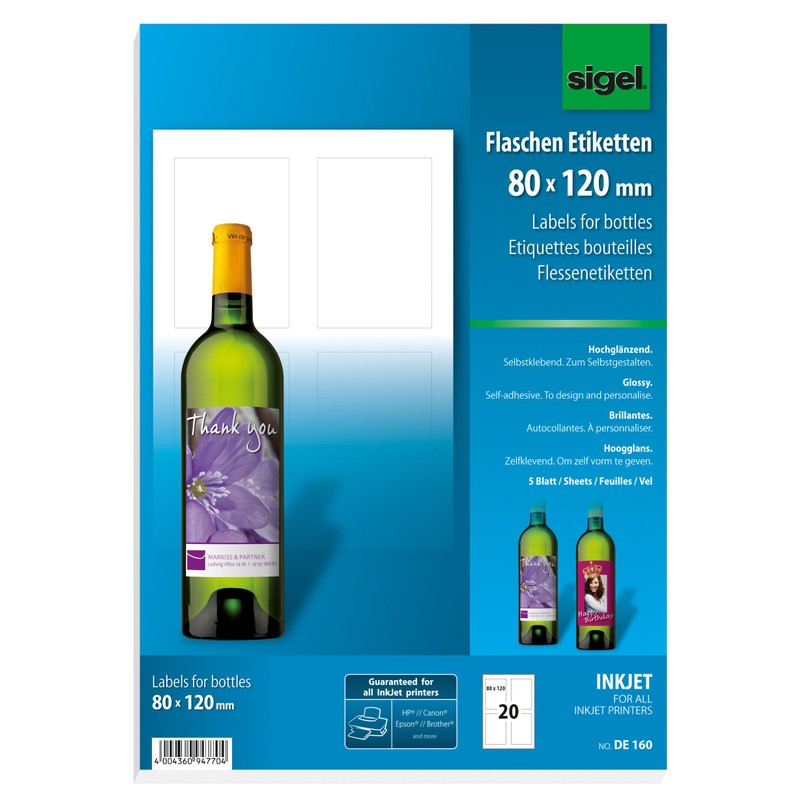 - Hochglänzende, selbstklebende Etiketten mit 85 g. Für alle gängigen Inkjet-Drucker geeignet.