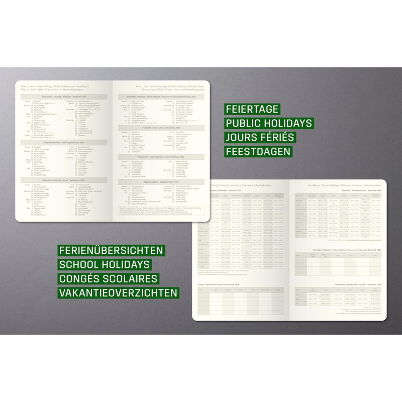 - Practical functions: elastic closure, pen loop, quick pocket, archive pocket, sticker sheet, 2 drawing ribbons, monthly and year overviews (also for 2027), holidays (DE/AT/CH/UK/FR/BE/NL), holiday overviews (DE/AT/CH/NL), units of measurement (EU/UK/US), time zone map