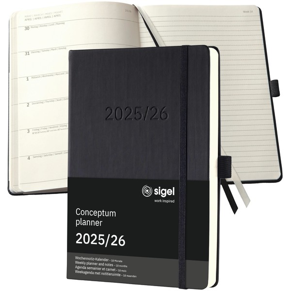 SIGEL C2603 Weekly Note Calendar 2025/2026, Approx. A5, Black, Hardcover, 256 Pages, Elastic Band, Pen Loop, Archive Pocket, Made of Sustainable Paper, 18 Month Calendar, Conceptum