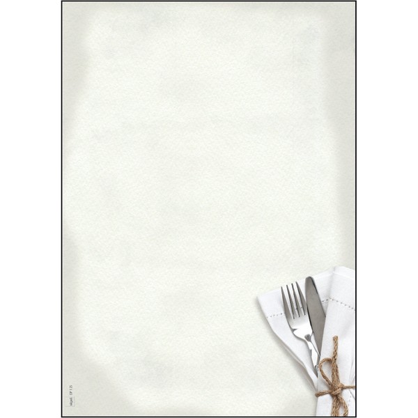 - Subtle grey/beige parchment look with menu motif (knife and fork), suitable for all courses, motif on one side