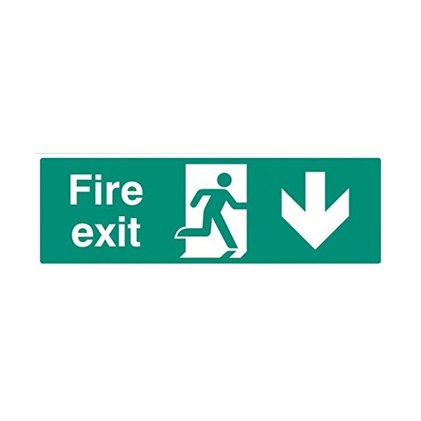 Sign, emergency exit, rp, outside height 150mm, outside width 450mm, sign colour white on green, sign legend fire exit arrow down, sign material plastic, sign type emergency exit, approval category BS 5499, personal protection & construction site safety signs