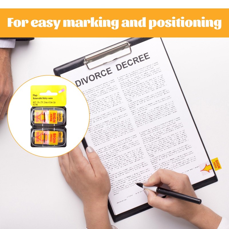 - REMOVABLE AND WRITABLE: The post it tabs are easy to remove and replace without damaging your books during the removal process, and you can write on the tabs with the word ‘sign here’ printed on the sticker and an arrow for easy identification.