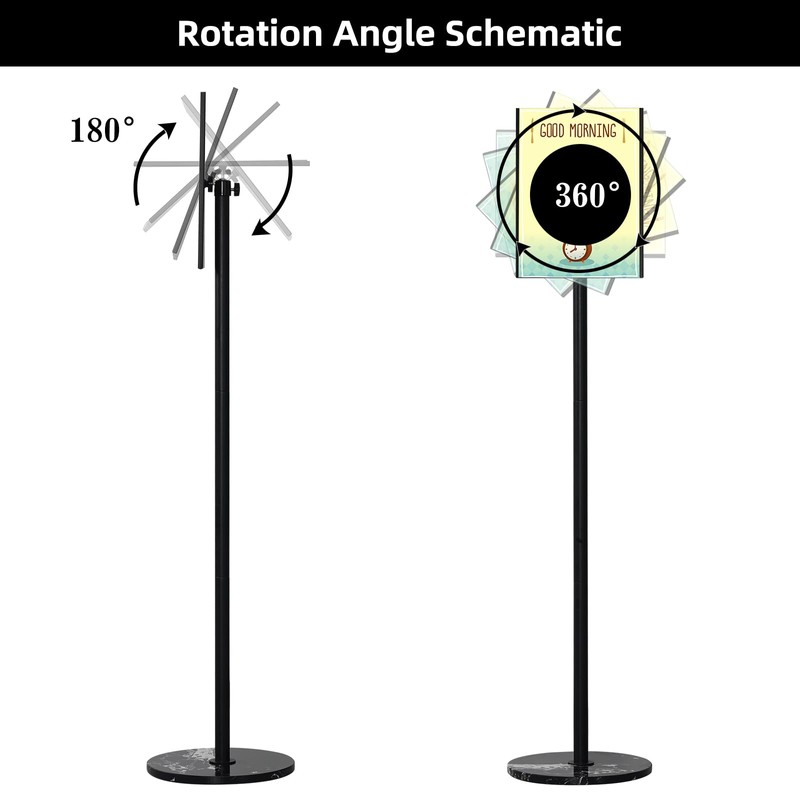 - Flexible 8.5 x 11 Sign Display: The provided sign holder accommodates 8.5 x 11 inch signs, making it suitable for showcasing essential announcements, promotional content, menus, or informational materials. The transparent acrylic panel ensures optimal clarity and safeguards your signs from dust and potential harm. The display stand offers a 360° rotation feature for effortless maneuvering.