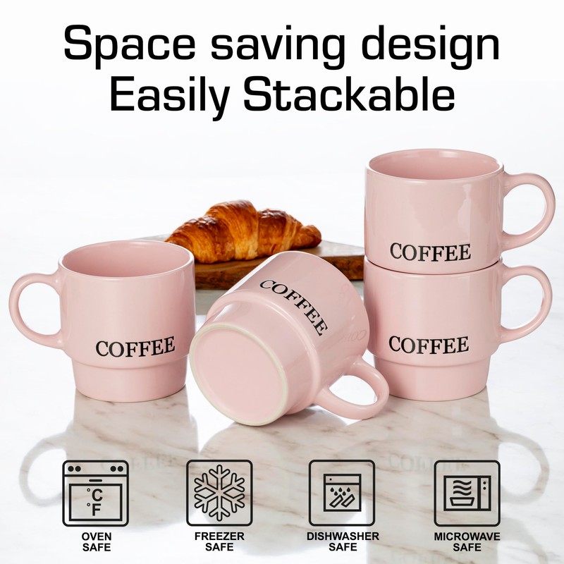 - COMPLETE SET: Includes 4 stackable pink stoneware mugs (15 oz each) and a sturdy metal display stand for organized storage and elegant presentation