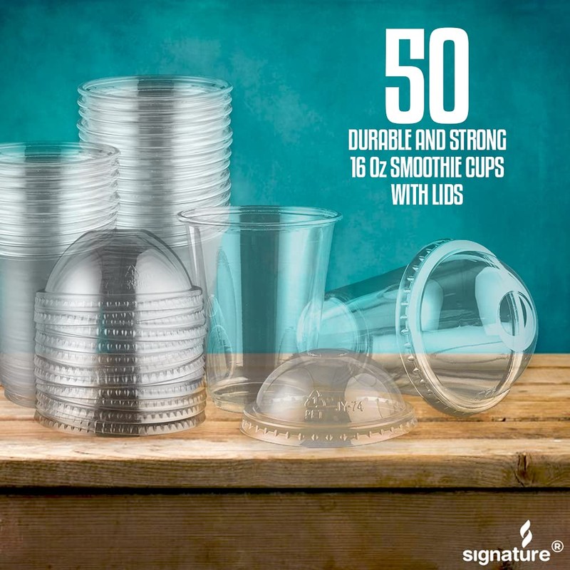 Signature Packaging Strong Plastic Smoothie Cups with Dome Lids - 50 Pack of 12 oz Plastic Cups with Lids for Smoothies, Milkshakes, and Thick Drinks - Recyclable and Reusable