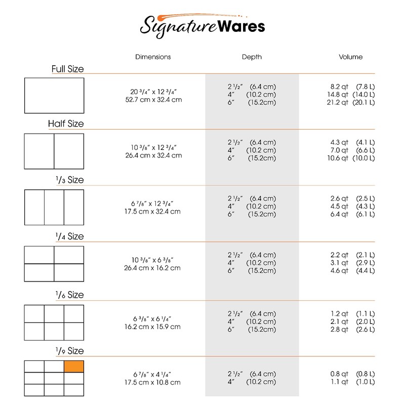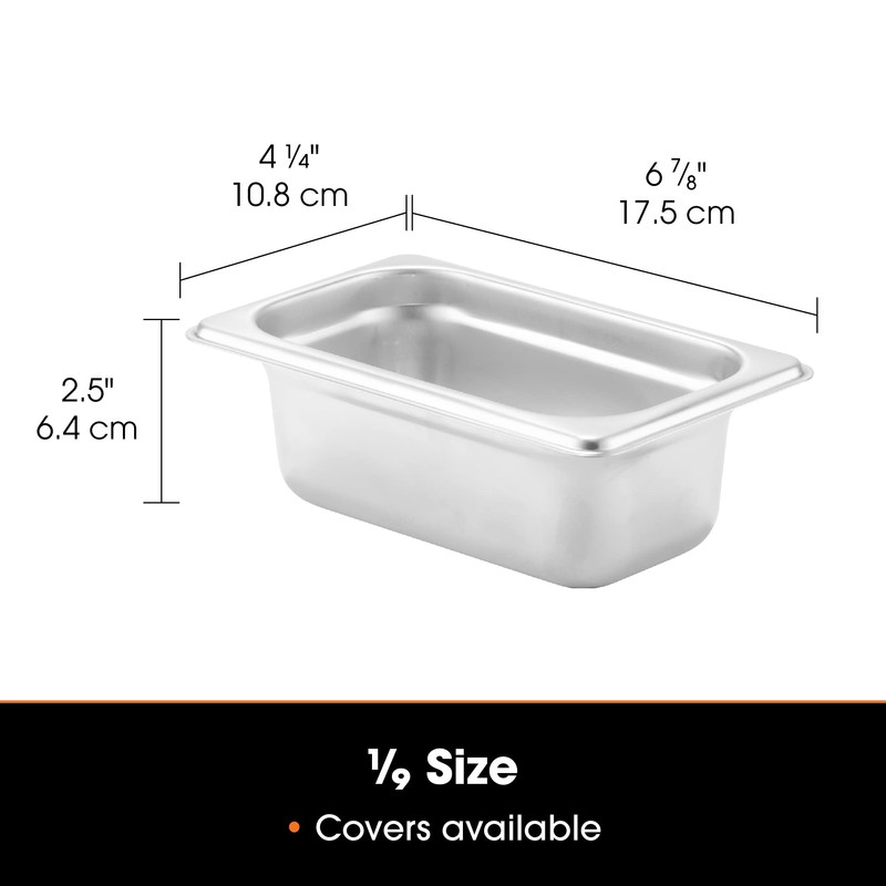 - ✅ PRODUCT SPECIFICATIONS – 1/9 Size Stainless Steel Steam Table Pan. Measurements: 6 7/8” x 4 ¼" x 2 ½" (17.5 cm x 10.8 cm x 6.4 cm). Capacity: 0.8 qt (0.8 L). Material: 24 gauge Stainless Steel.