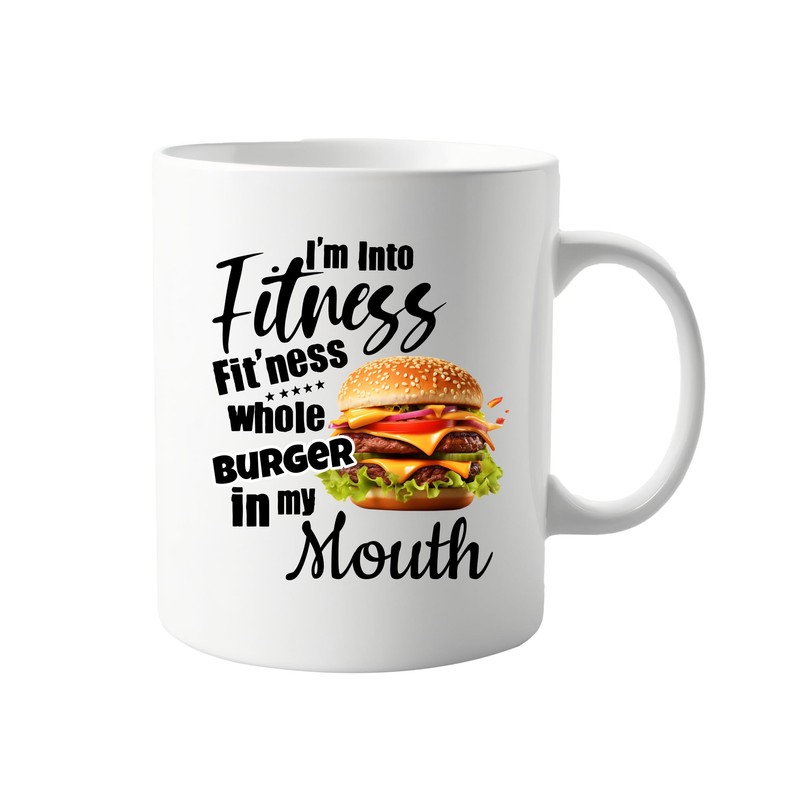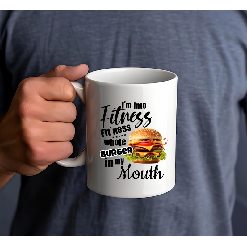 signkitsuk I'm Into Fitness,Fit Ness Whole Burger in My Mouth Gym Lover Joke – Funny Coffee Cup for Workout Enthusiasts, Foodies & Fitness Buffs – Great for Home, Office, or Gag Gift