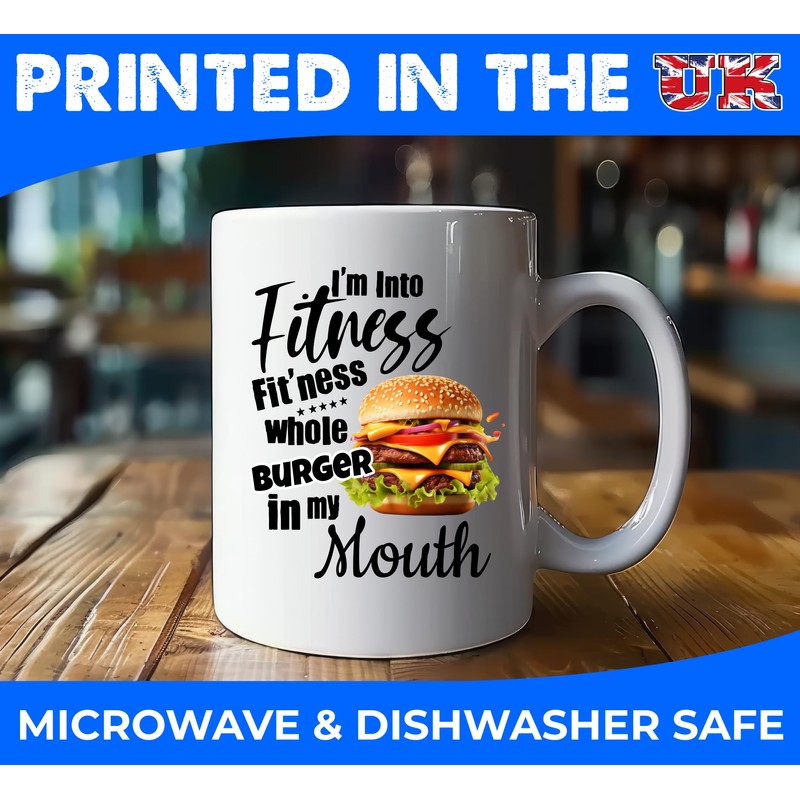 signkitsuk I'm Into Fitness,Fit Ness Whole Burger in My Mouth Gym Lover Joke – Funny Coffee Cup for Workout Enthusiasts, Foodies & Fitness Buffs – Great for Home, Office, or Gag Gift