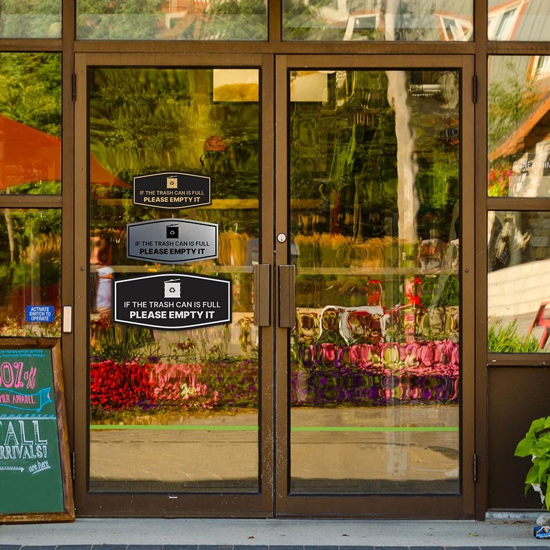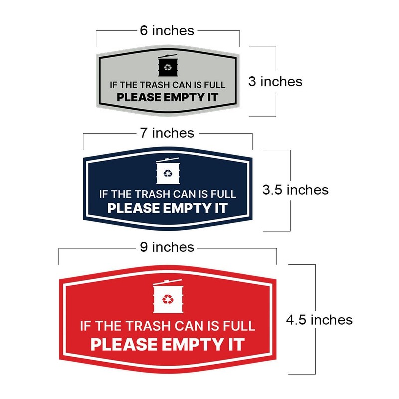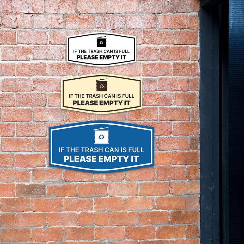 Our Signs ByLITA Fancy If the Trash Can is Full, Please Empty It Sign can be attached to the door, wall or window of your home or business. The sign text and design work is laser engraved into sturdy plastic. Each sign comes with an adhesive foam backing, allowing them to be attached to any flat surface. Comes in multiple colors. Our trash can signs are great for your home, business or property. Small sign is 3"H X 6" W