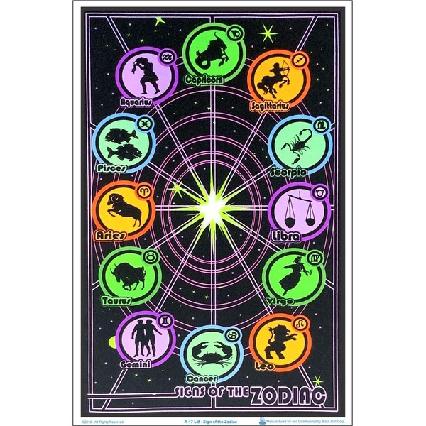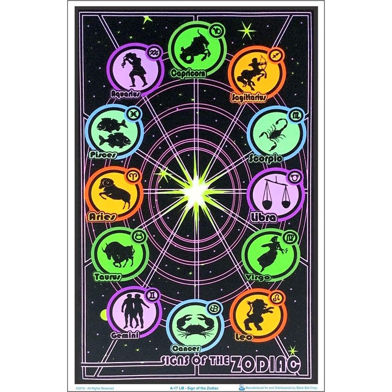 - Sized 23" x 35" to Complement Any Room: This poster of zodiac signs is perfect for lightening the mood, giving any room a good times vibe in normal light, or a magical touch under a blacklight.