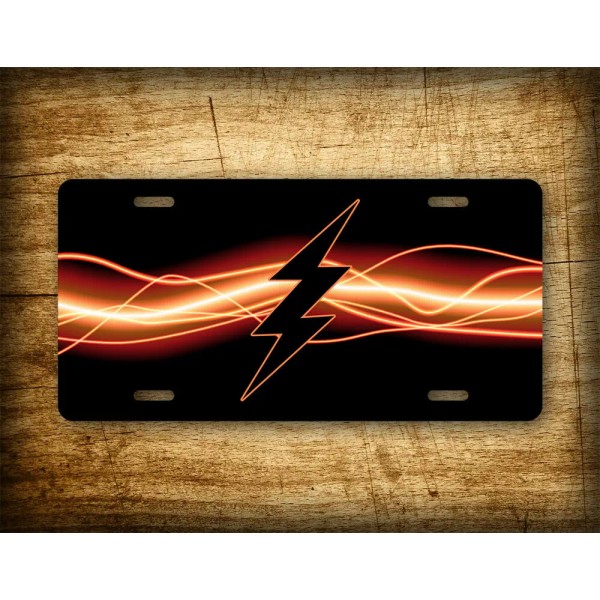 This license plate features a black background with a light flash going from one side of the license plate to the other and a black lightning flash logo on the front.- All metal with gloss finish. This license plate is UV and fade resistant. Outdoor service life is approx. 18-24 months. Indoor service life, indefinite. Not embossed.