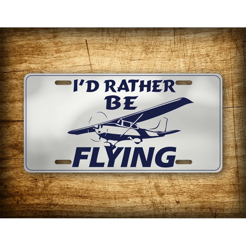 This pilot's license plate features a clean silver looking background with an airplane silhouette and the text "I'd rather be flying."- Simple aviator license plate featuring the text "I'd rather be flying" and the likeness of a Cessna 172.