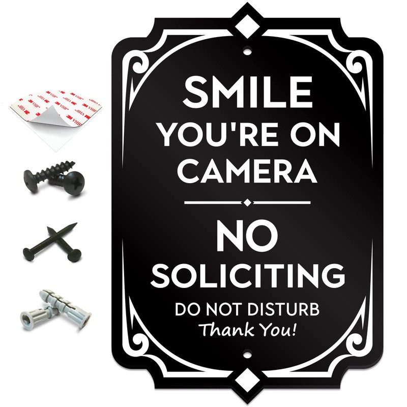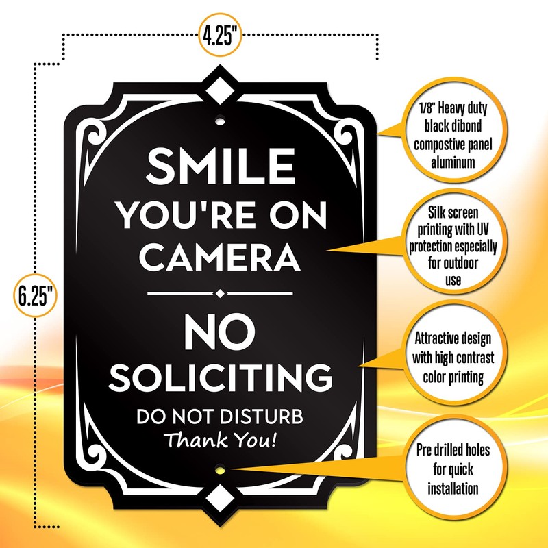- GET NOTICED - The sign states "SMILE YOU’RE ON CAMERA – NO SOLICITING DO NOT DISTURB Thank You”. The unique design, high-quality printing, and bright color contrasts will catch the eye of anyone coming close to your office or residence and guarantee that your property stays safe and keeps solicitors away. Tasteful and powerfully effective.
