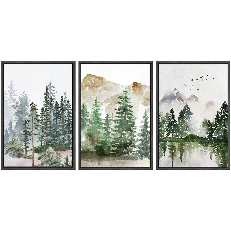 SIGNWIN Framed Canvas Print Wall Art Set Pastel Mountain Range Forest Mist Nature Wilderness Illustrations Modern Art Decorative Rustic Calm/Zen for Living Room, Bedroom, Office - 24"x36"x3 Black