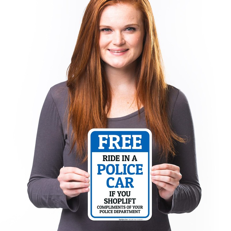Sigo Signs, Free Ride in A Police Car If You Shoplift Compliments of Your Police Department Sign, 10x7 Inches, 4 Mil Vinyl Decal Stickers Weather Resistant, Made in USA