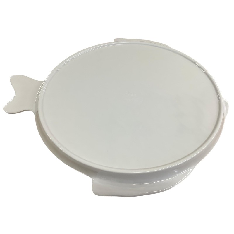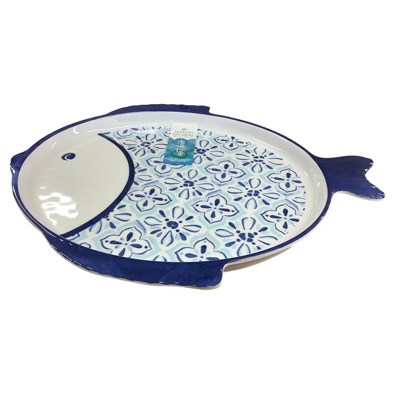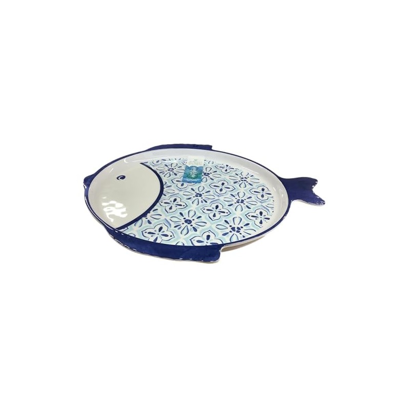 - DESIGN: Beautiful fish-shaped melamine plates featuring a blue and white floral pattern with decorative tail detail