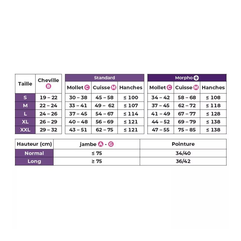These tights have been designed to adapt perfectly to every body type. Available in several sizes (S to XXL), two heights (Normal and Long) and two morphologies (Standard and Morpho +), they ensure a perfect fit. The high-comfort pantyhose, featuring "Tech by Zone" technology, are knitted in five specific zones, guaranteeing freedom of movement and support without excessive compression.