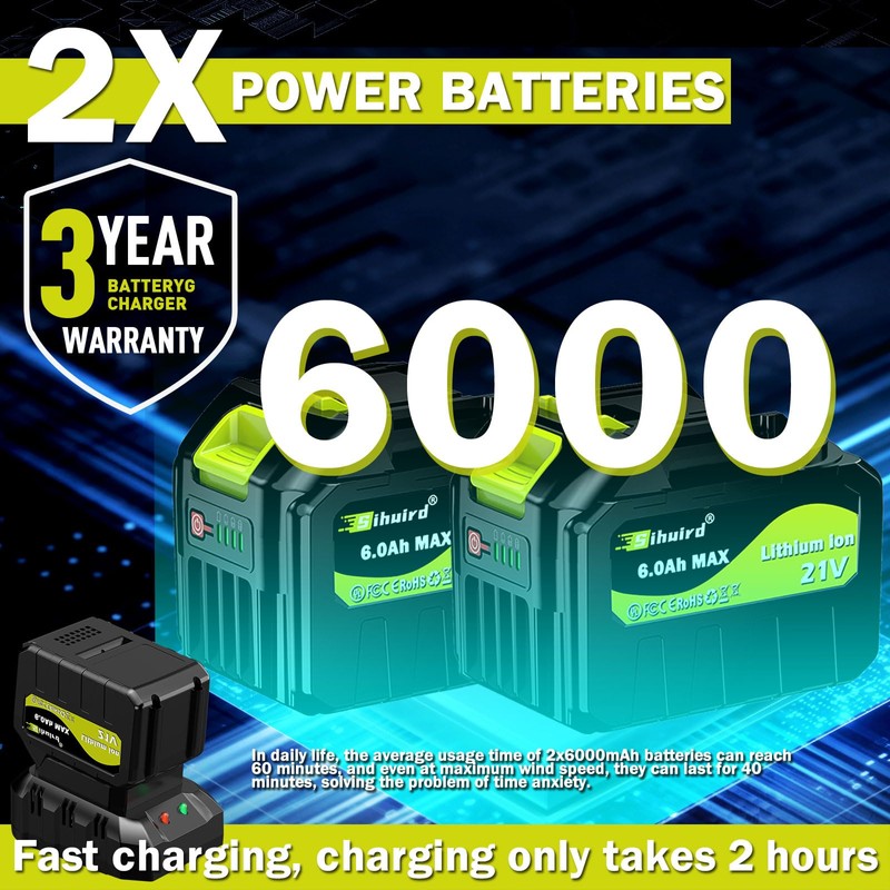 - 【Fast Charging】:The Sihuird Cordless Leaf Blower is equipped with a fast charger, and a 6000mAh high-capacity battery can be charged in just 2 hours.