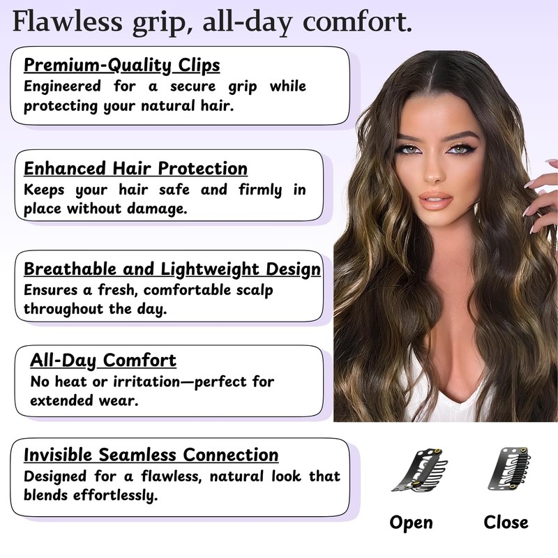 • ♥WHAT'S SPECIAL?♥ Our extensions use double wefts instead of single. The non-slip clips are firmly sewn into each weft, making them easy to wear and remove without pulling at your scalp (your hair will thank you). Plus, the high-quality slim silicone-backed clips with a PU design keep the extensions invisible and securely in place. Oh, and did we mention they're made from advanced, high-quality fibers? Because your hair deserves tech that’s a cut above the rest!