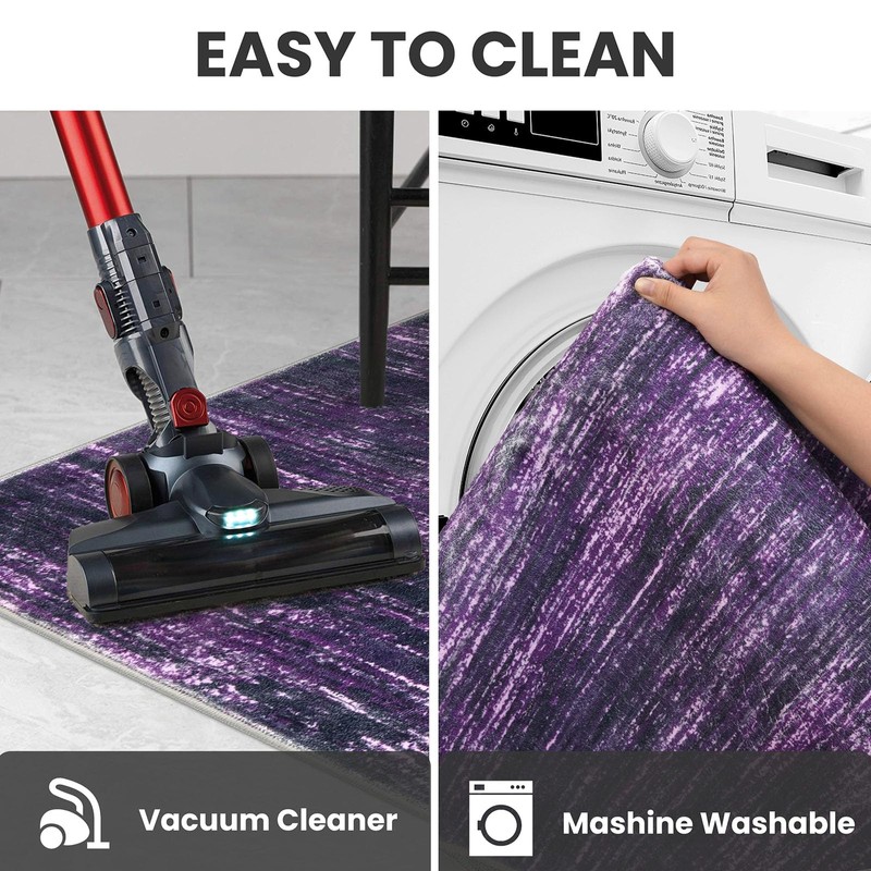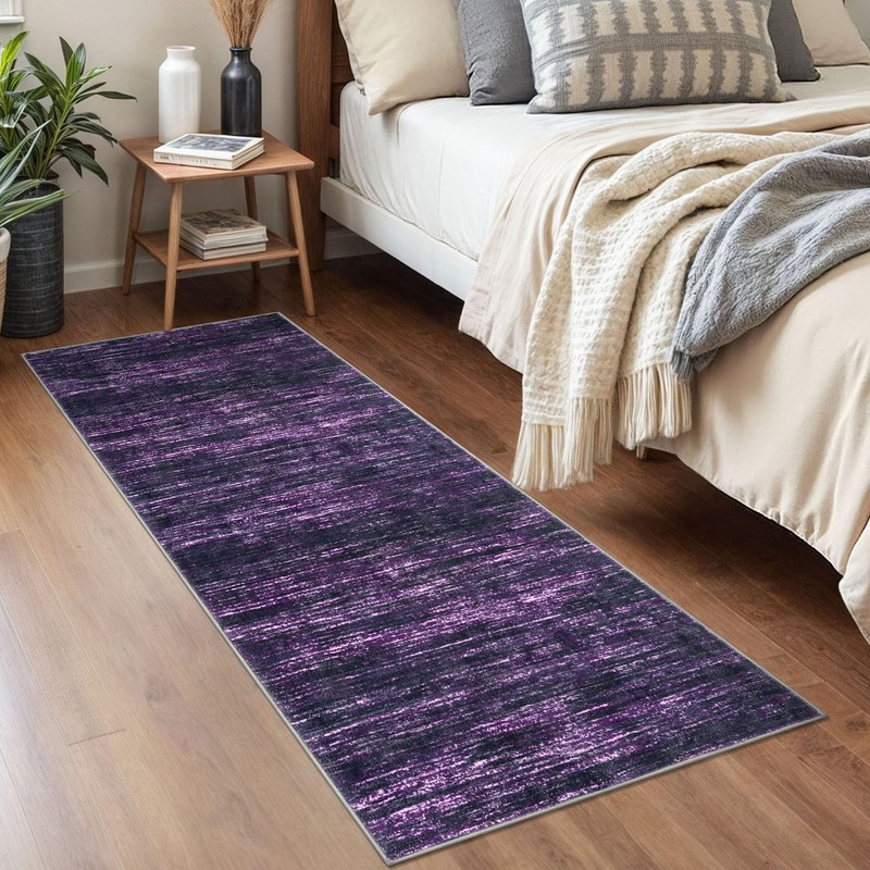 - Product Details: Size: 2x5 Feet (24x60 Inches). Color: Purple/White. Thickness: 0.34 inches. Style: Showcases a bold, abstract streaked pattern with a modern, textured design. Note:Color may vary slightly in different lighting