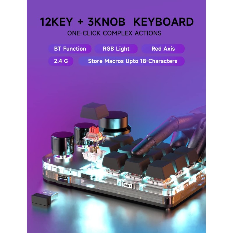 SIKAI CASE Macro Keyboard, 2023 Model, One-Handed Keyboard, Supports 3 Connections, 2.4 G Receiver, 12+3 Programmable Keyboard with RGB, Red-Axis Mechanical Keyboard, Axis Replaceable