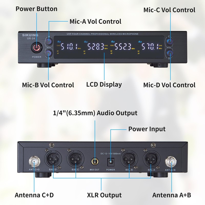 - 【FLEXIBLE CONNECTION OPTIONS】The receiver has one 6.35mm (1/4”) TRS Output and 4 XLR Balanced Output for easy setup with your home karaoke or speaker system. It works with a wide range of sound bars, home receivers, speakers, audio mixers and etc.