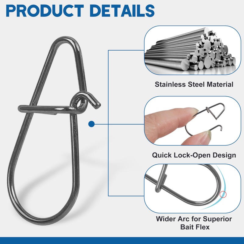 - QUICK CHANGE: Fishing snap clips feature a quick lock-open design, allowing you to change leaders or lures in seconds. simplifying the process of fishing and saving the time of changing bait,Enjoy more wonderful fishing time.