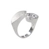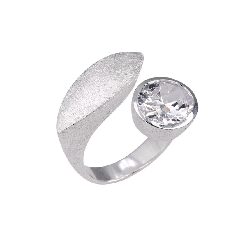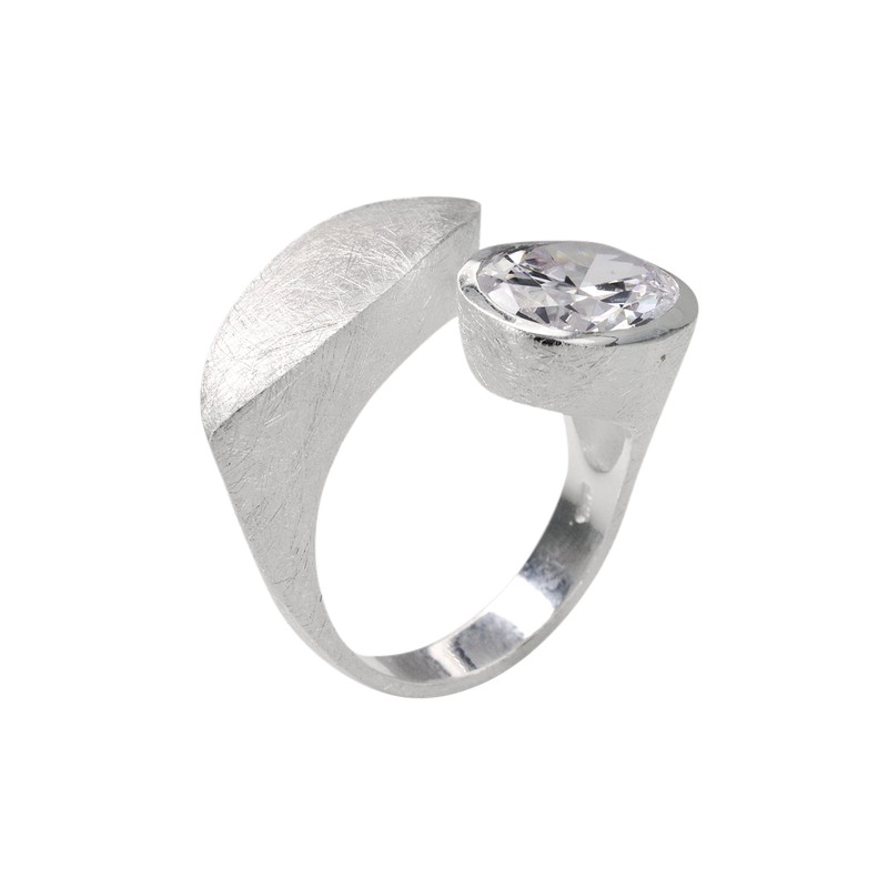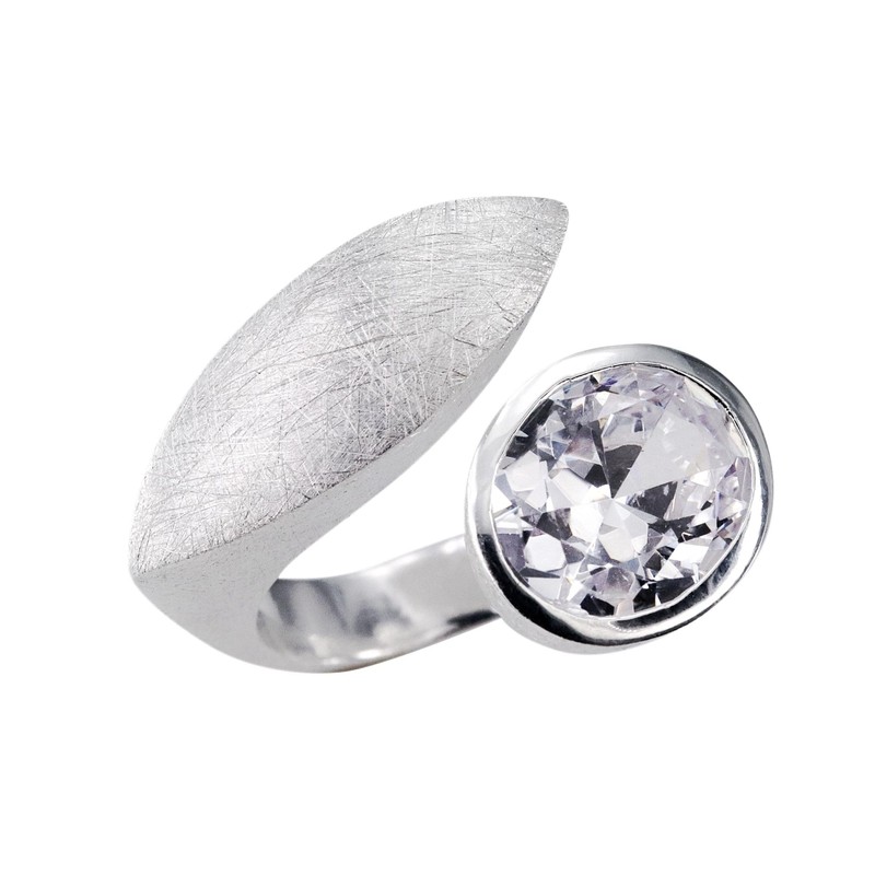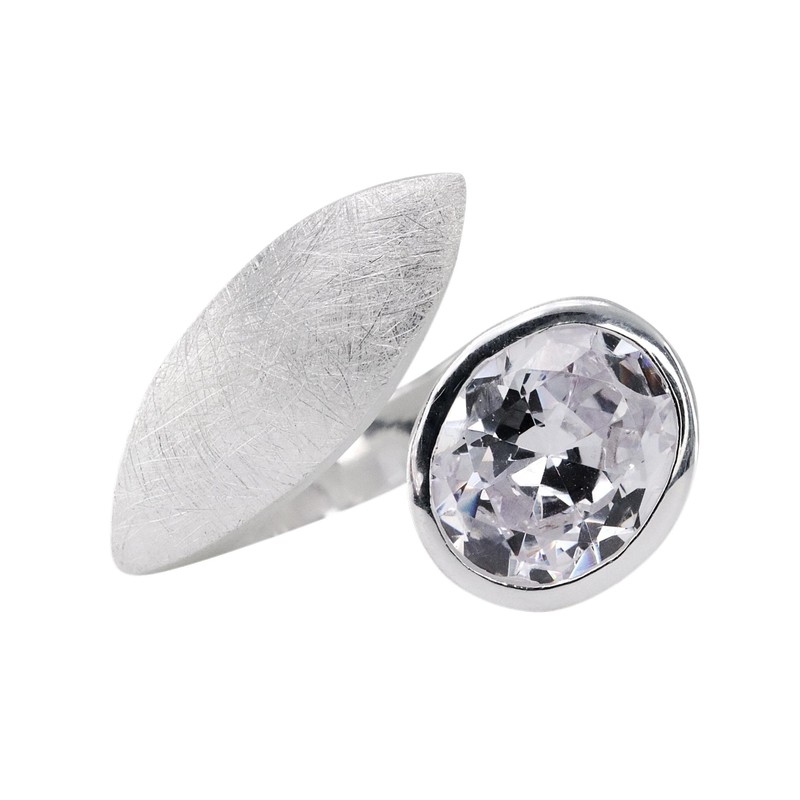 The brushed and navette-shaped silver element sits at an angle on the finger, which causes the hand to be visually stretched. The cubic zirconia is very clear and decorated with a diamond cut, which makes it charming shine and shine. In addition, it sits in a fixed frame, which gives it the necessary stability: exactly fitting and not glued. As the socket is open downwards, light can pass through the stone, which is beautiful to look at.