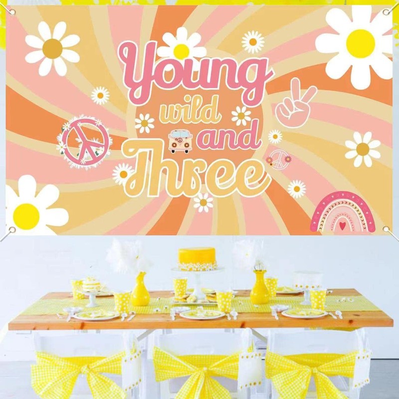 - Groovy Three Birthday Decorations:1 pcs “young wild and three” girl party backdrop and 1 roll of ribbon for hanging.This 70's hippie theme birthday background is designed with graceful white daisy flowers,rainbow,eye-catching fonts,which will add an impressive tough to the birthday party.
