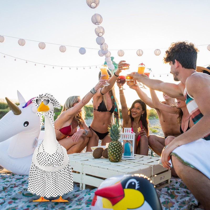 The goose outfit set including a bikini, a hat, a skirt and sunglasses are designed to good fit your goose, offering an aesthetic and stylish appearance. This turns your normal yard or cement goose into a beauty.