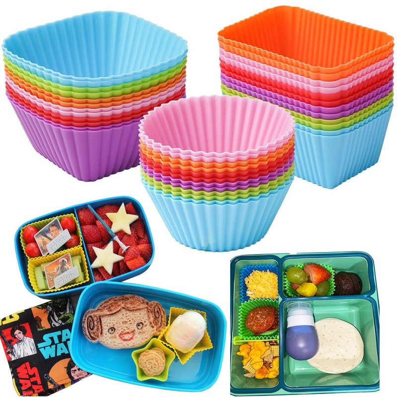 Silicone Bento Lunch Box Dividers 3 Shapes of Standard Round & Square & Rectangle - Reusable Silicone Cupcake Liners Non-Stick Muffin Cups for Baking