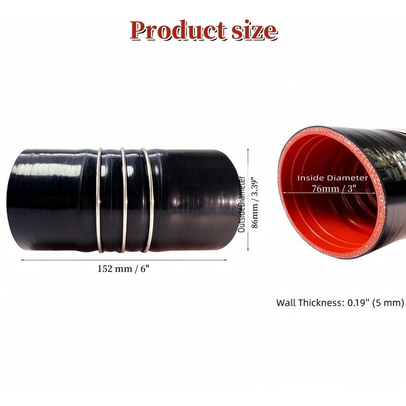 - Hose Inside Diameter: 3" (76mm), Hose OutsideDiameter: 3.39" (86mm), Hose Length: 6" (152.4mm), Wall Thickness: 0.19'' (5 mm), Number of Rings: 3, Temperature Range: -40 F to +392 F, Max Pressure: 100 psi