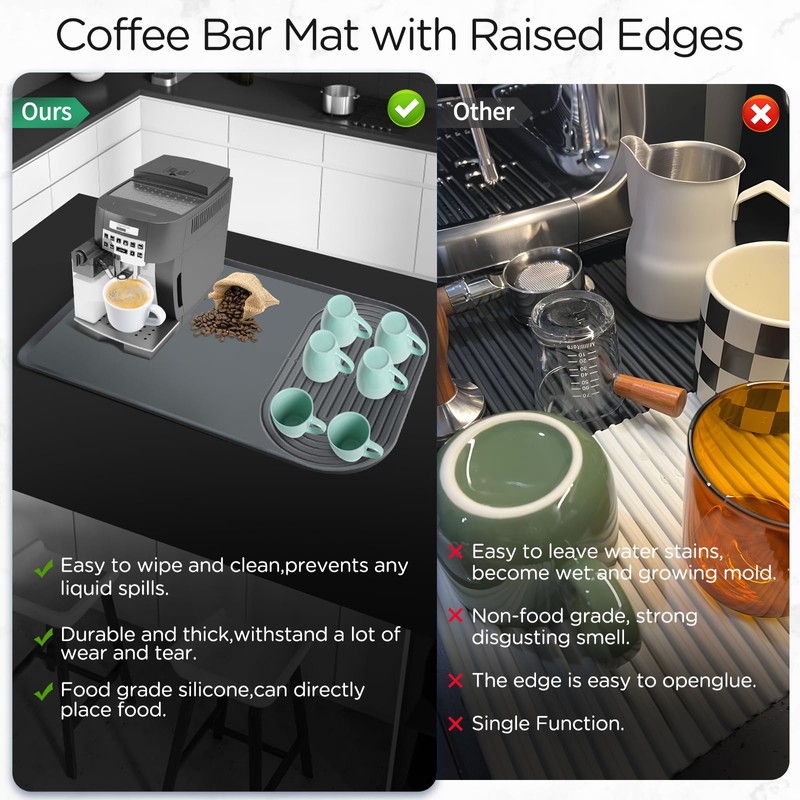- 【Anti-Spill and Easy to Clean】The coffee mat for counter is designed with a raised 0.5IN edge high, which can accommodate large amounts of liquids, prevent leakage or effectively contains spillage, Waterproof material can hold anything liquid, such as coffee, oil, water, ice etc, can protect your counters from damage caused bydrips, leaks, spills, stains. Easy to clean, simply clean the mat by wipe or rinse.