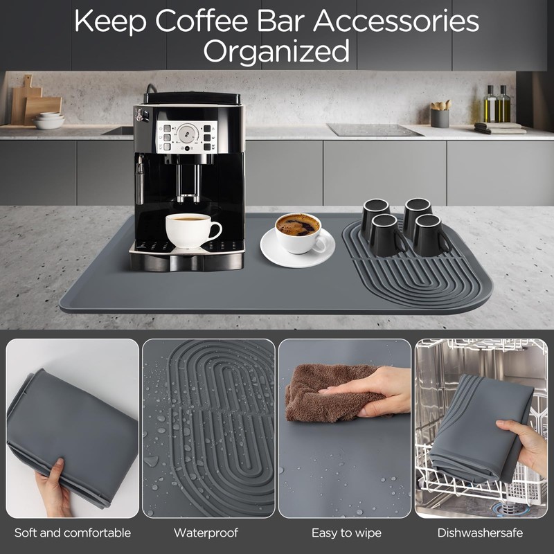 Silicone Coffee Mat, 24''x16'' Coffee Bar Mat with Raised Edges, Fit Coffee Bar Accessories, Kitchen, Beverage Bar, Under Coffee Maker Espresso Machine, Dish Rack and Drying Mat (Grey, 24''x16'')