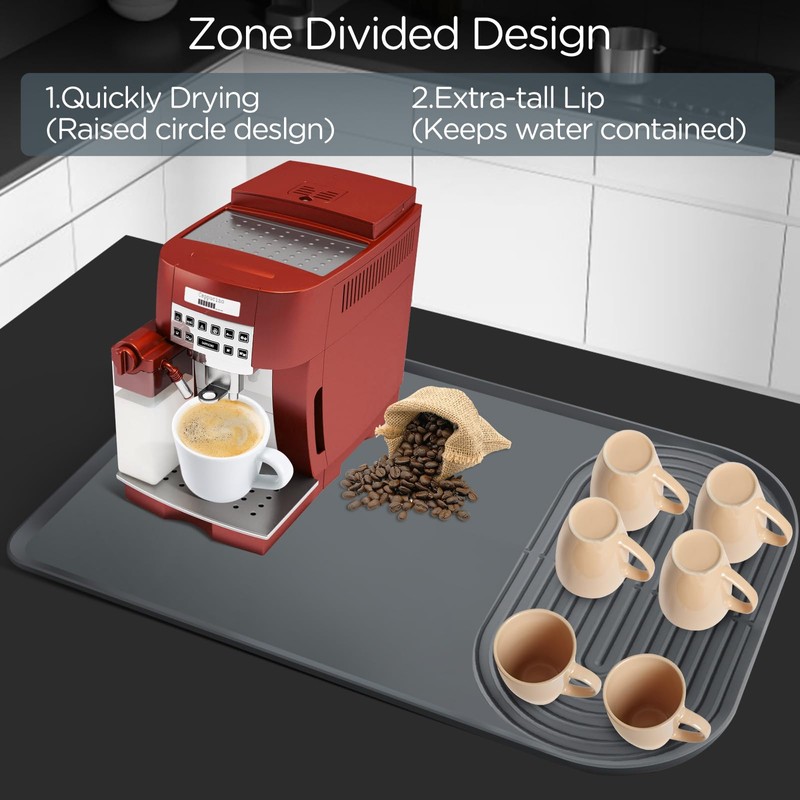 - 【Zone-Divided Design】The silicone coffee maker mat has 2 areas, 2/3 areas provides a spacious and heat-resistant surface to place, mainly used to place major equipment such as coffee machines, 1/3 areas has a efficient drainage function, which is convenient for air-dry or placing coffee bar accessories, whether they have just been washed or a cups, spoons, and filters ready for use.