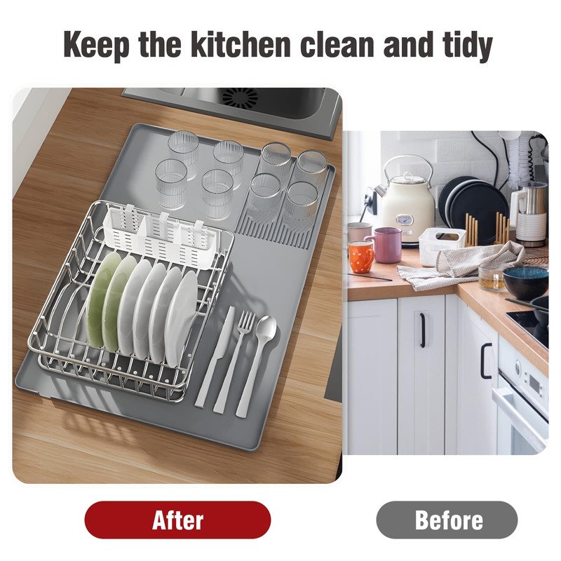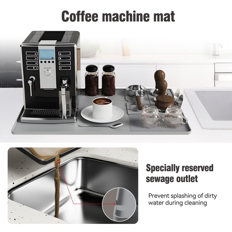 - 【Heat-Resistant Silicone Mat】Coffee bar matwith Removable Dish Drying Mat for Countertops Made of food-grade silicone rated for 392°F (200°C), this mat protects countertops from espresso machines, hot tools, and spills. Sleek gray complements modern kitchens.