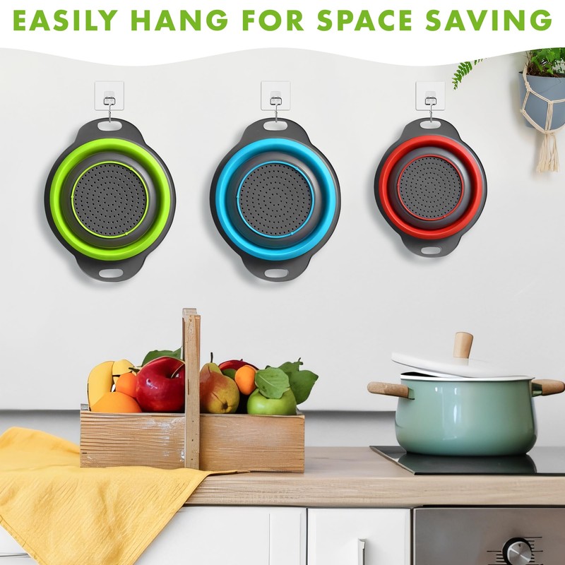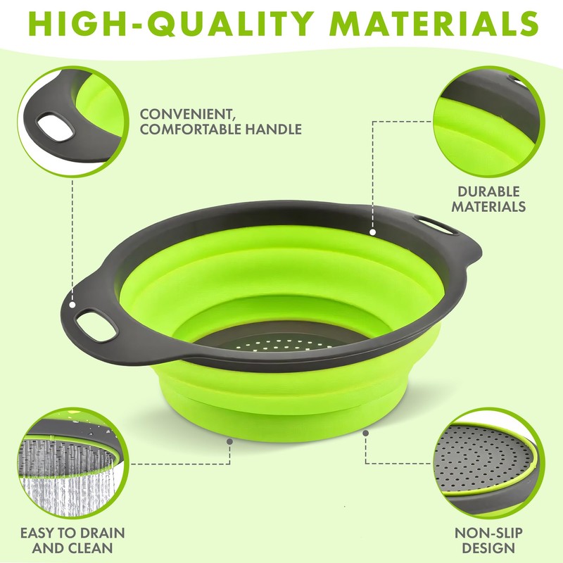 - Compact and Versatile: Our collapsible strainers and colanders are designed for maximum convenience. This collapsible colander strainer easily folds flat, making it ideal for small kitchens or travel.